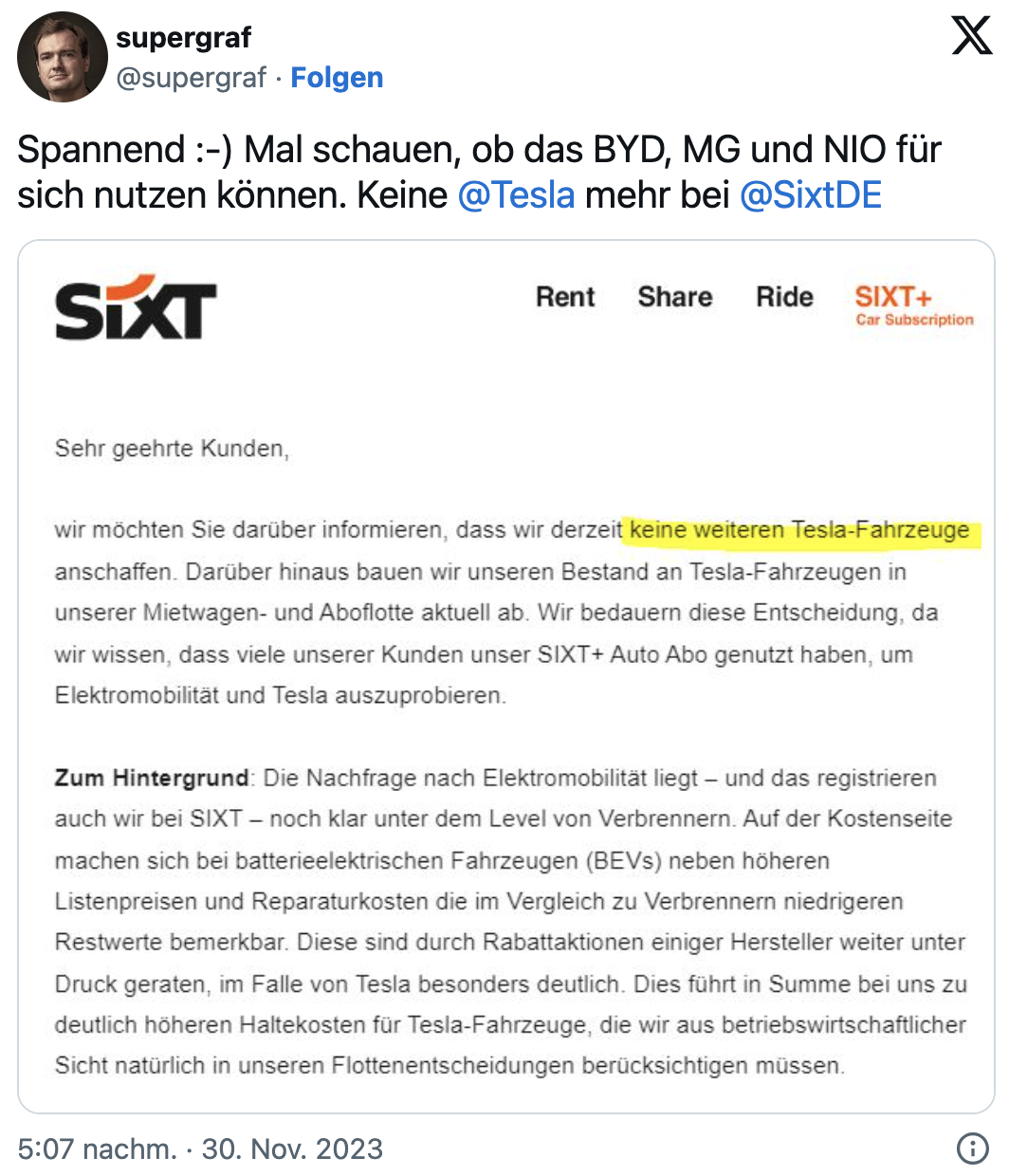 Sixt称,特斯拉高昂的维修费用以及保值率不理想,成为其被抛弃的重要原因。该公司还补充表示,特斯拉车型留下的缺口,将通过宝马、奔驰、奥迪以及比亚迪的电动车型予以弥补。