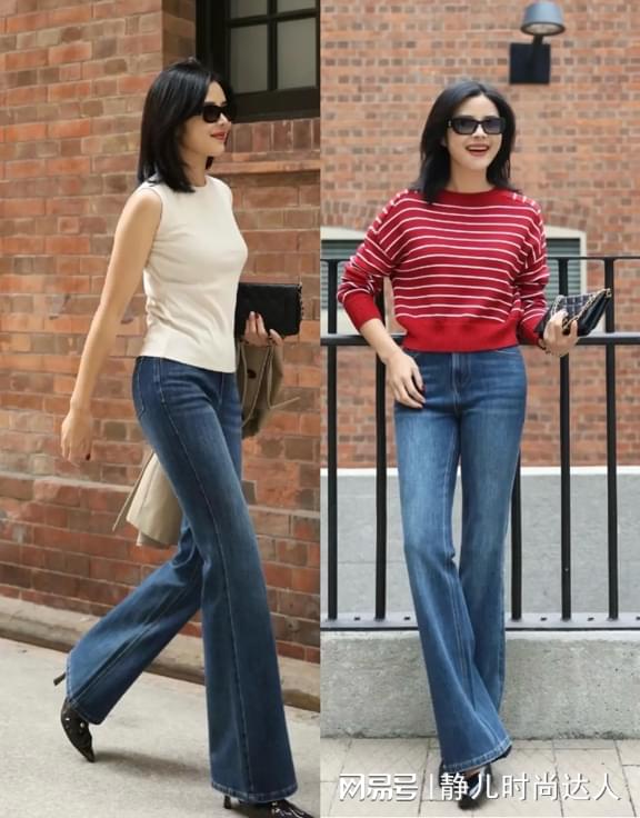 追求优雅的中年女性,她们更喜欢尝试经典款,比如牛仔裤其实就是一种非常实用且百搭的经典服饰,不擅长搭配的你可以选择这种高腰的喇叭牛仔裤,配上简单的无袖背心和针织衫,也相当的时髦大方。