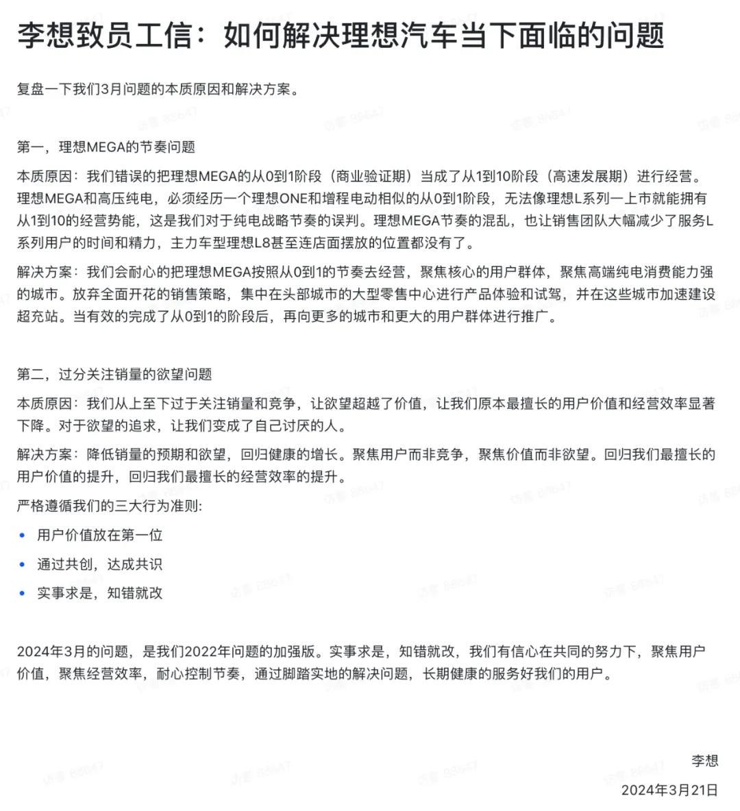 在这封内部信中李想表示,理想存在过于关注销量和竞争的问题,让欲望超越了价值。在当时,李想表示下一步会“聚焦用户而非竞争”,“聚焦价值而非欲望”。