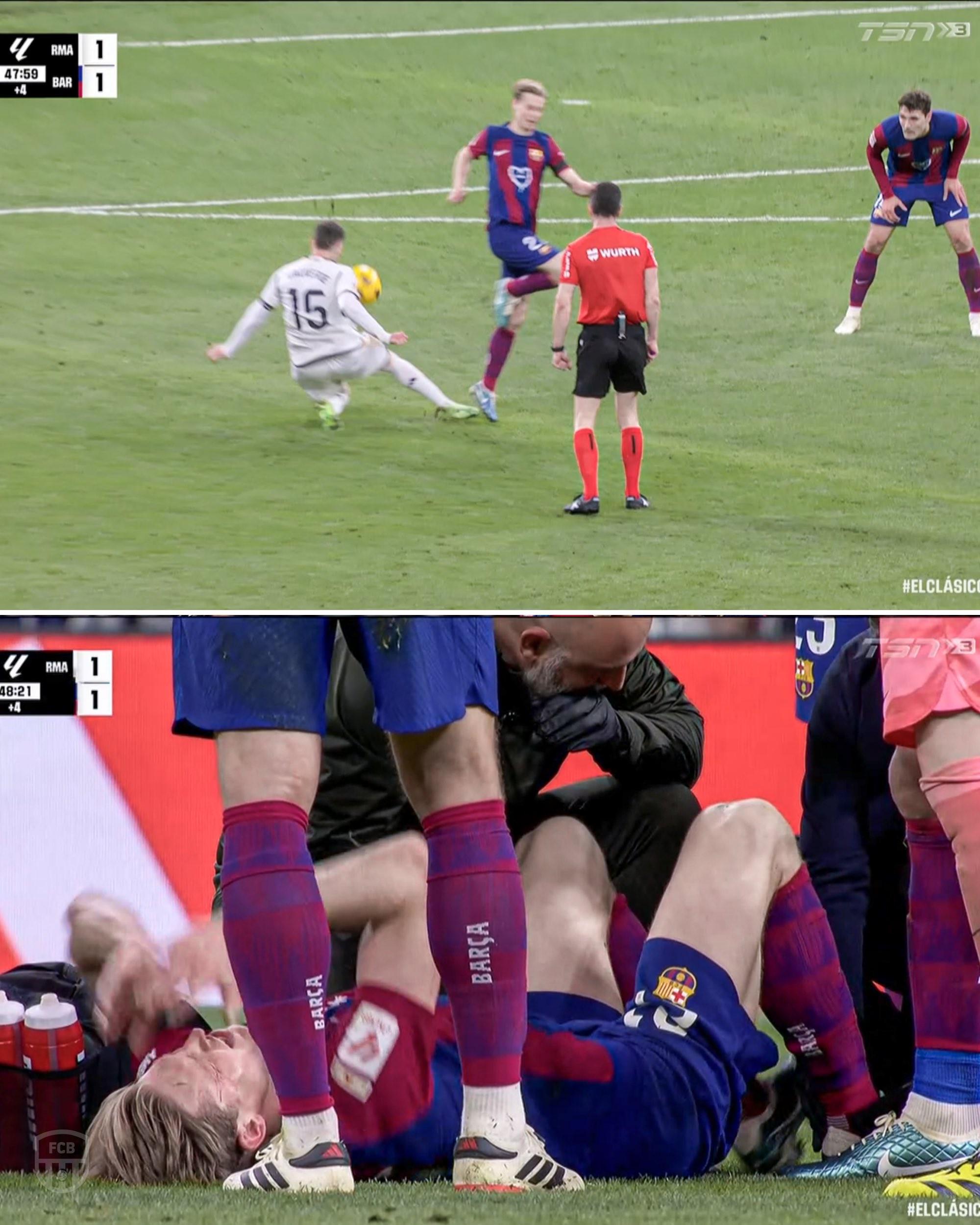 此役对阵皇马,德容在与巴尔韦德在一次拼抢中对脚后受伤,这位巴萨中场受伤的位置似乎又是右脚踝,科贝电台记者Helena Condis Edo也确认德容伤到的是同一只脚踝。