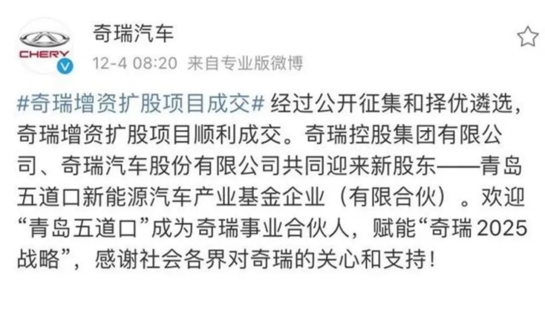 根据知情人士介绍,此次“青岛五道口”参与奇瑞增资扩股的200亿元,其中首期缴纳的100亿元,就是主要来自青岛市即墨区下属国有投资平台及山东省内大型企业。可以说,即墨区是青岛五道口的重要基石投资者。