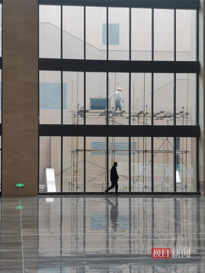 大厅右侧墙面的大屏幕中,播放着洞庭湖的纪录片,讲述洞庭湖的历史和人文风情。通往二楼的楼梯已经被围挡封住,听得见楼上传来的施工声音。一旁的天井内,工人正在搭脚手架准备施工。