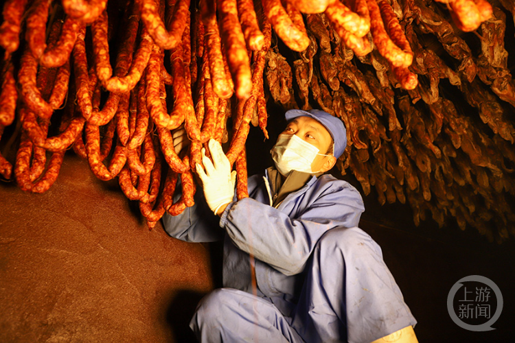 炕房里,一排排香肠和腊肉整齐悬吊,在柴火的慢熏下散发出扑鼻的香气。工人们适时翻转,调整位置,使其均匀。