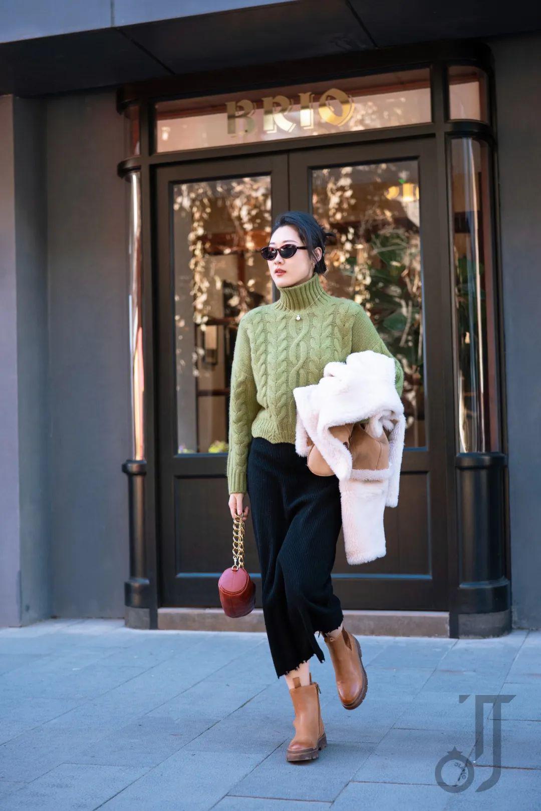 因为我这套主体单品是绿毛衣,所以其他颜色就稍微素净些,用外套的大面积米色和下装的黑色来平衡色彩感