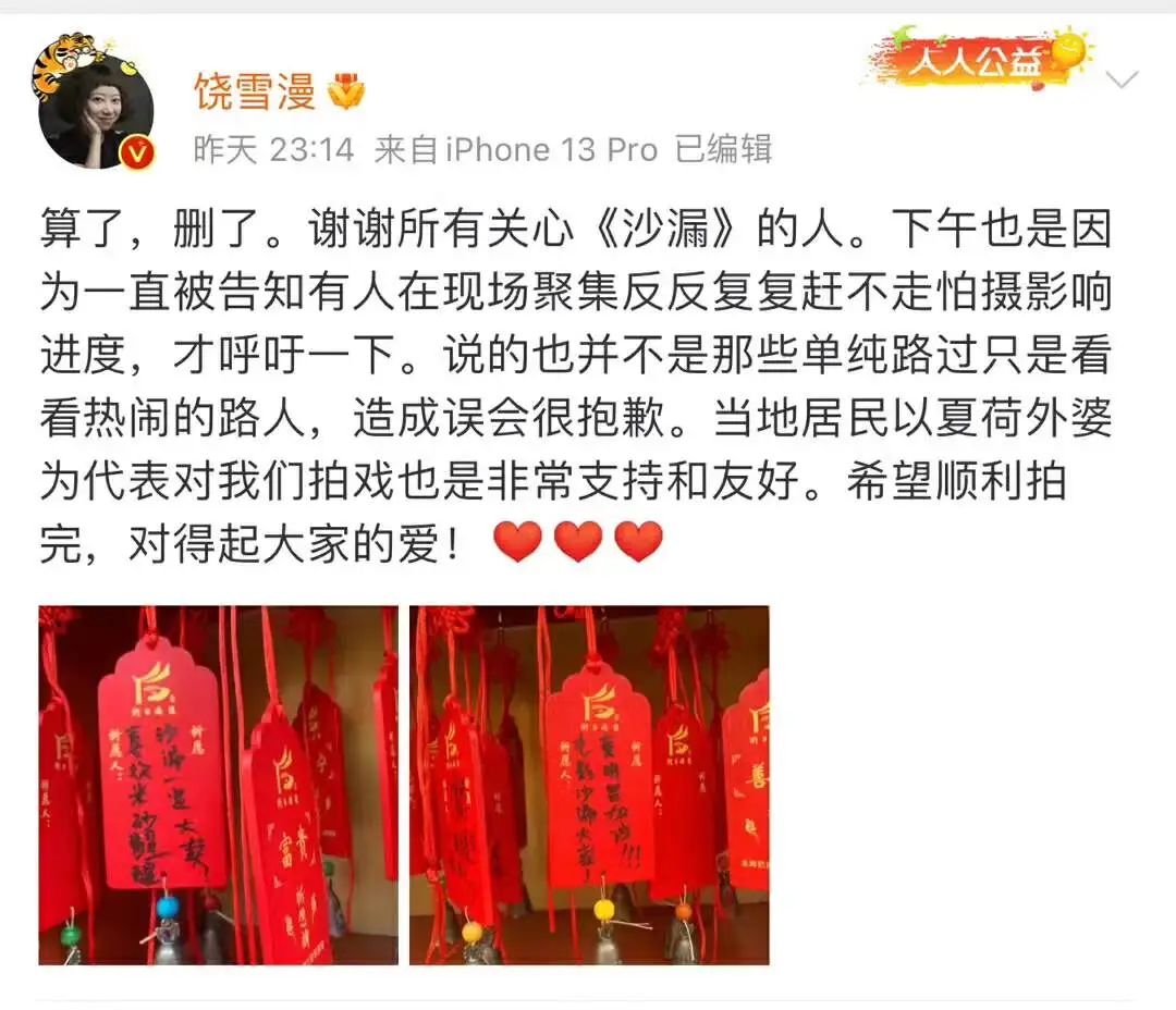 拍摄电影《沙漏》时,饶雪漫遇到了场地人群聚集的情况。