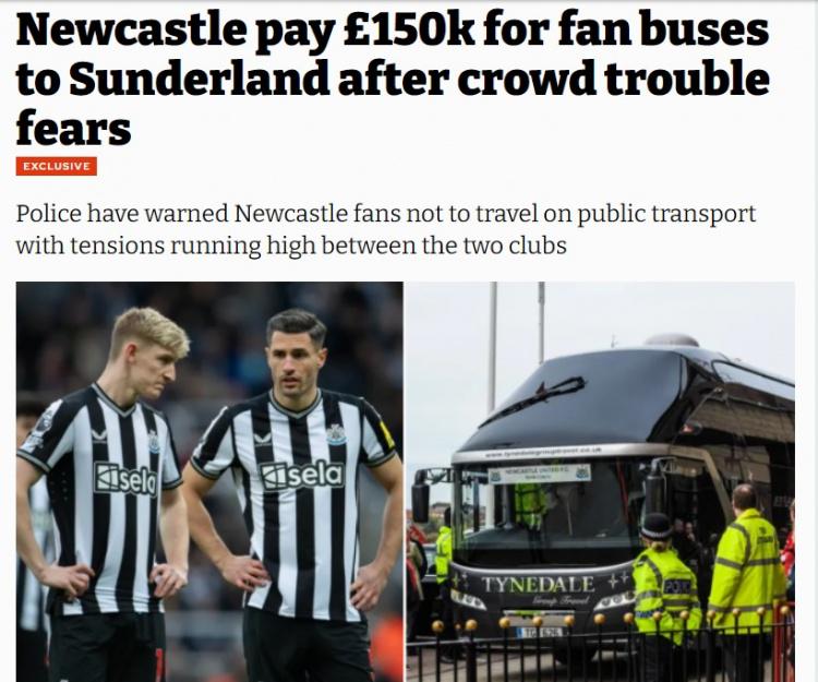 直播吧1月5日讯 北京时间1月6日20:45,足总杯第3轮将上演“泰恩河德比”,桑德兰主场迎战纽卡斯尔,这是八年来这对死敌的第一场德比之战。“inews”消息,为了保障安全,纽卡斯尔俱乐部花费了15万英镑,租用了120辆大巴,送6000名球迷前往光明球场。