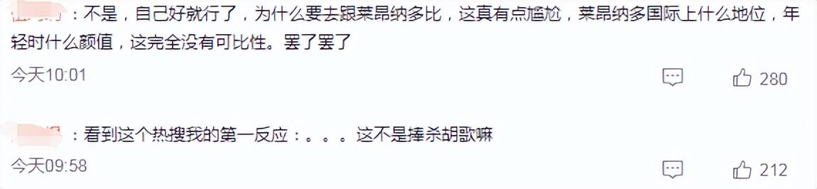 莱昂纳多因《泰坦尼克号》红遍全球,人送“球草”名号。显然,这条热搜也是夸赞胡歌的帅气,只是没想到网友并不买账,不仅不认可胡歌的帅气,也不认可胡歌的演技,表示两者存在较大差距,没有可比性,捆绑在一起是越级碰瓷。