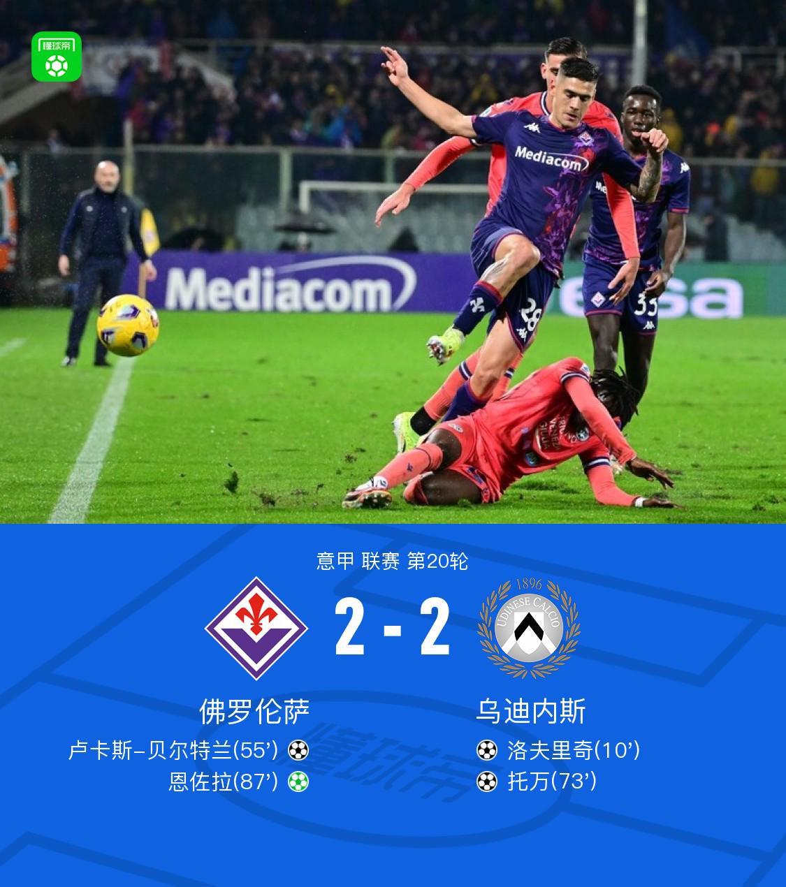 北京时间1月15日意甲 联赛 第20轮,佛罗伦萨主场对阵乌迪内斯。上半场,洛夫里奇低射破门,洛伦佐-卢卡远射被扑。下半场,贝尔特兰头球扳平,托万推射破门,恩佐拉点射建功,最终,佛罗伦萨2-2乌迪内斯。