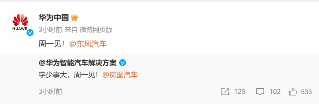 1月20日午间,华为智能汽车解决方案、岚图汽车、华为中国和东风汽车等多个官方微博集体发文。其中华为智能汽车解决方案和岚图汽车均发布“字少事大,周一见!”,同时相互@到对方。