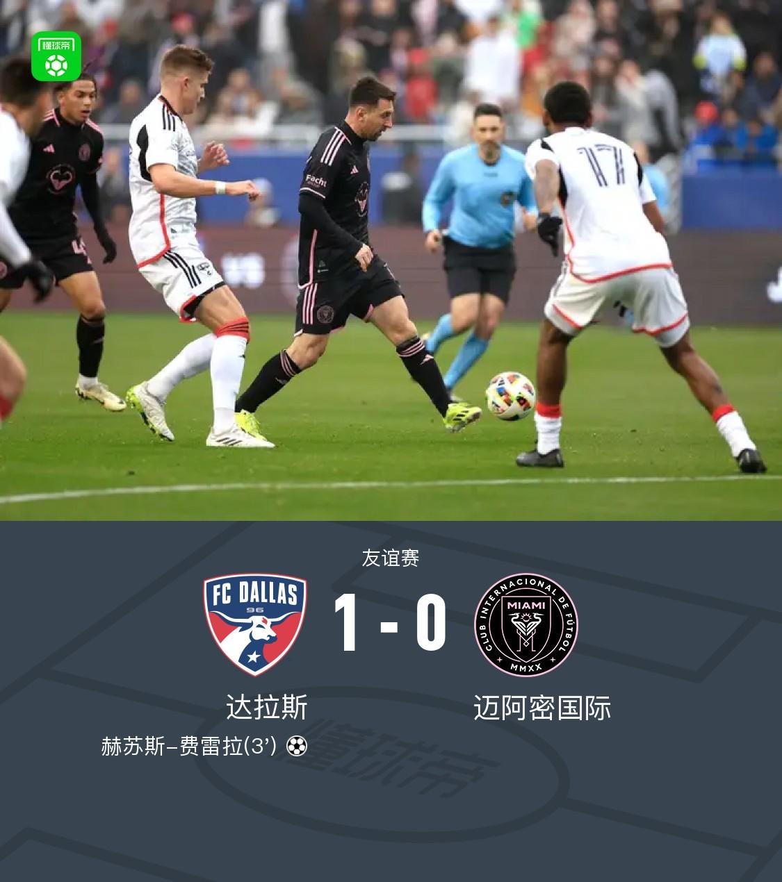 北京时间1月23日友谊赛,达拉斯主场对阵迈阿密国际。上半场费雷拉闪击破门,梅西打门被扑,苏亚雷斯禁区垫射踢高,下半场双方机会寥寥,梅西第63分钟被替换下场。最终迈阿密国际0-1落败。