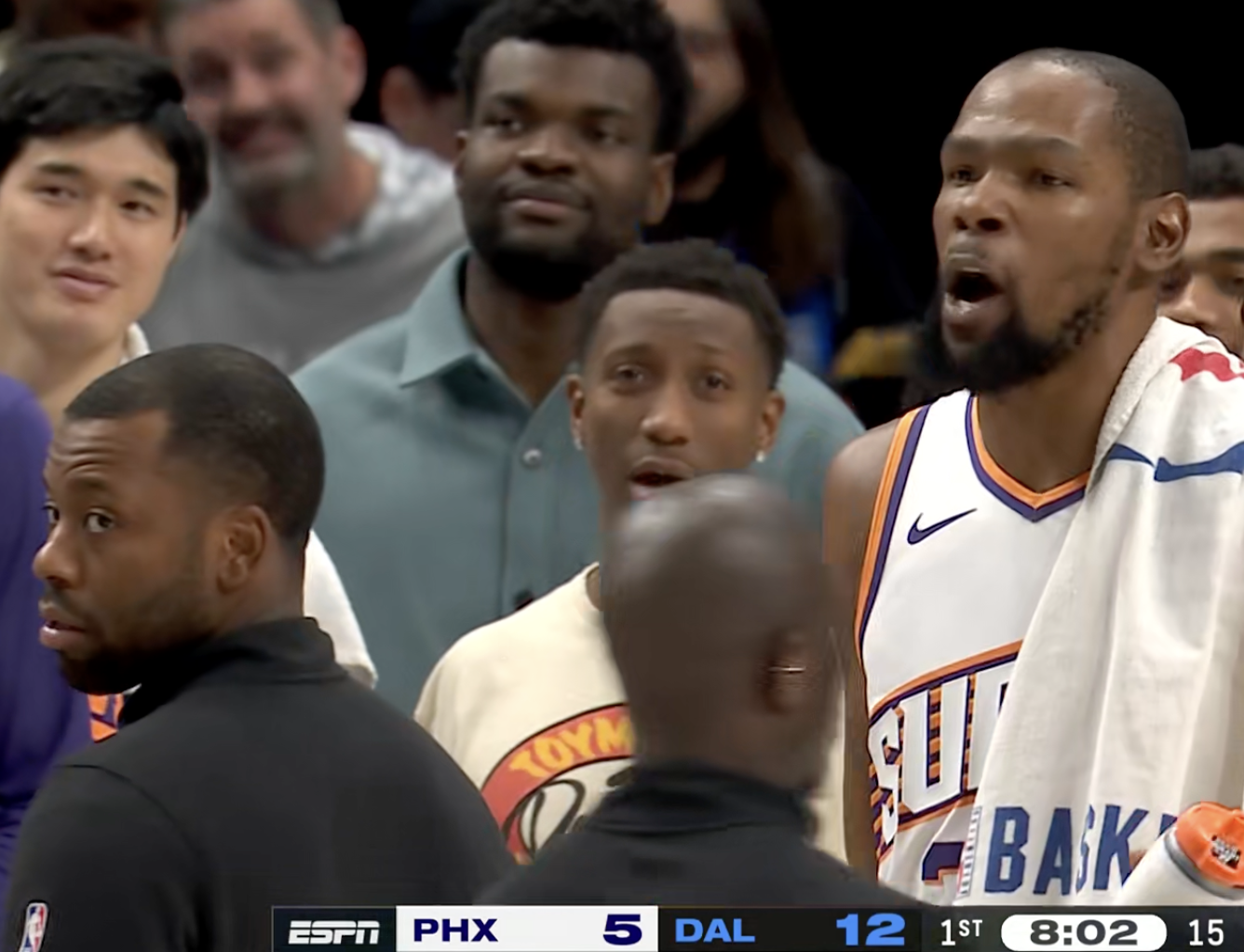 太阳对决独行侠,比赛第一节打了不到4分钟,场上就爆发了激烈冲突,格威挑衅杜兰特,双方乱成一团。