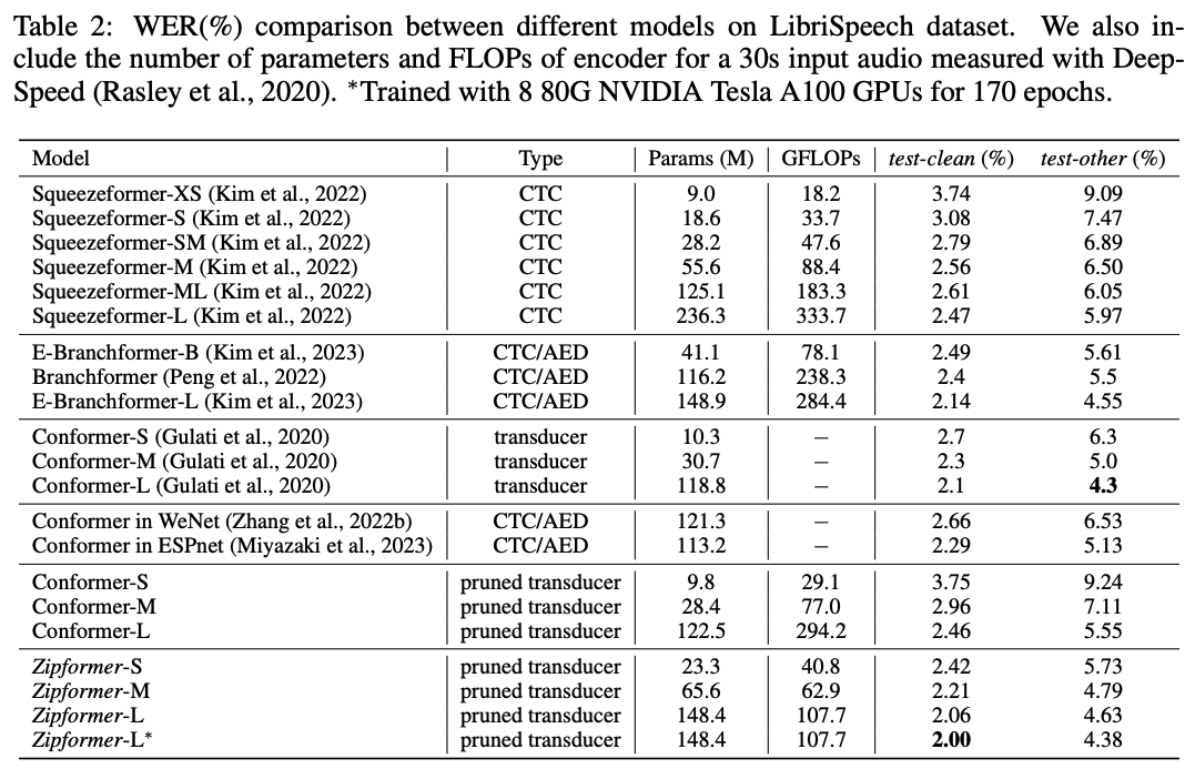 表 2 展示了 Zipformer 和其他 SOTA 模型在 LibriSpeech 数据集上的结果。对于 Conformer,我们还列出了我们复现的结果以及其他框架复现的结果。值得注意的是,这些结果和 Conformer 原文仍然存在一定的差距。Zipformer-S 取得了比所有的 Squeezeformer 模型更低的 WER,而参数量和 FLOPs 都更少。Zipformer-L的性能显著超过 Squeezeformer-L,Branchformer 和 我们复现的 Conformer,而 FLOPs 却节省了 50% 以上。值得注意的是,当我们在 8 个 80G NVIDIA Tesla A100 GPU 上训练 170 epoch,Zipformer-L 取得了 2.00%/4.38% 的 WER,这是我们了解到的迄今为止第一个和 Conformer 原文结果相当的模型。