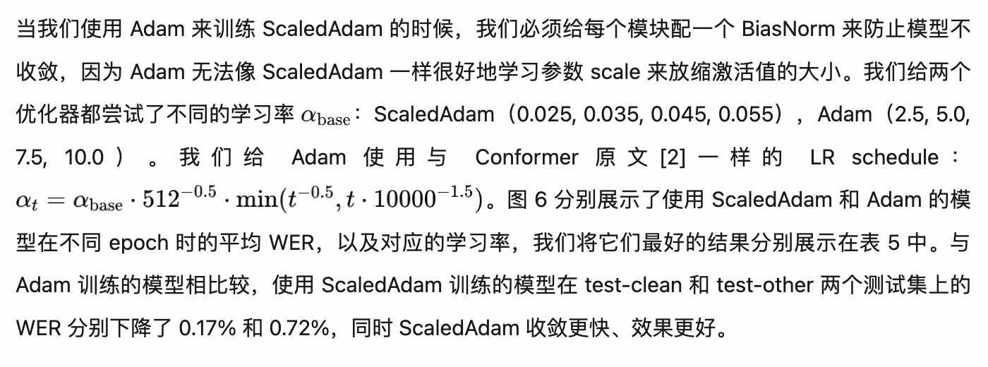 Downsampled encoder structure,降采样到不同的帧率,学习不同粒度的时域信息Zipformer block,更深的 block 结构,通过复用注意力权重提高效率BiasNorm,允许保留一定的长度信息Swoosh 激活函数,比 Swish 效果更好ScaledAdam 优化器,根据参数大小放缩更新量,保持不同参数相对变化一致,并显式学习参数大小,比 Adam 收敛更快、效果更好Balancer 和 Whitener,限制激活值,稳定训练