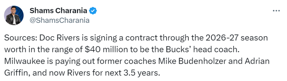 北京时间1月26日,据名记Shams报道,消息人士透露,道格-里弗斯和雄鹿签下的是一份总价4000万美元的合同,合同年限是3.5个赛季,里弗斯将执教至2026-27赛季。这意味着雄鹿将同时向布登霍尔泽、阿德里安-格里芬和里弗斯三位教练支付薪水。