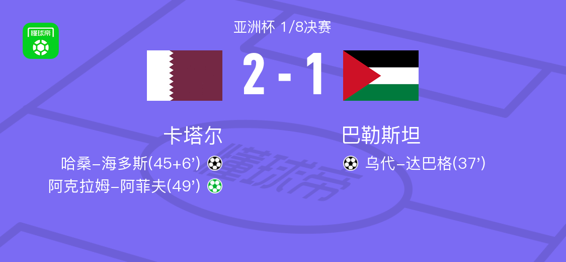 北京时间1月30日亚洲杯 1/8决赛,卡塔尔主场对阵巴勒斯坦。卡塔尔哈桑-海多斯破门,阿克拉姆-阿菲夫破门。巴勒斯坦乌代-达巴格破门。最终比分2-1。