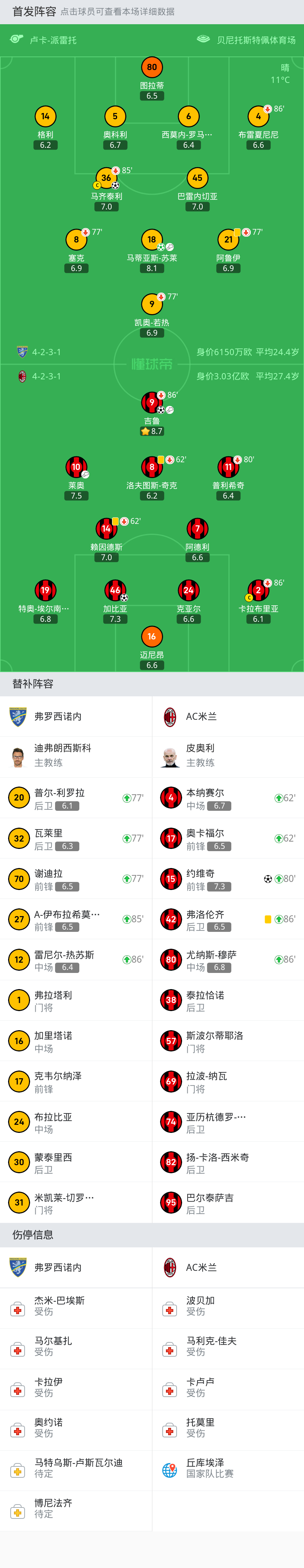 弗罗西诺内首发:6-西莫内-罗马尼奥利, 36-马齐泰利, 14-格利, 21-阿鲁伊, 80-图拉蒂, 4-布雷夏尼尼, 9-凯奥-若热, 5-奥科利, 45-巴雷内切亚, 8-塞克, 18-马蒂亚斯-苏莱