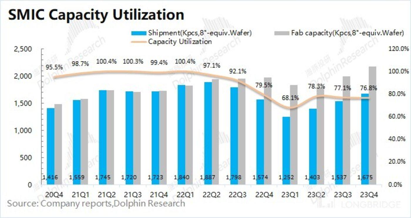 2023 年第四季度中芯国际的产能利用率 76.8%,本季度公司的产能利用率继续维持低位。海豚君认为公司本季度的出货量有所提升,而产能利用率仍在低位,主要是受公司近期仍在逆周期扩产的影响。
