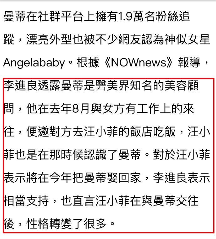 撮合汪小菲和曼蒂的媒人是湾湾知名整容医生李进良,他透露曼蒂是医美界知名的美容顾问,外形神似Angelababy,社交平台拥有1.9万粉丝。去年8月,李进良和曼蒂有了工作上的往来,于是邀请曼蒂去汪小菲的饭店S-HOTEL吃饭,汪小菲也是在那时候认识了曼蒂。